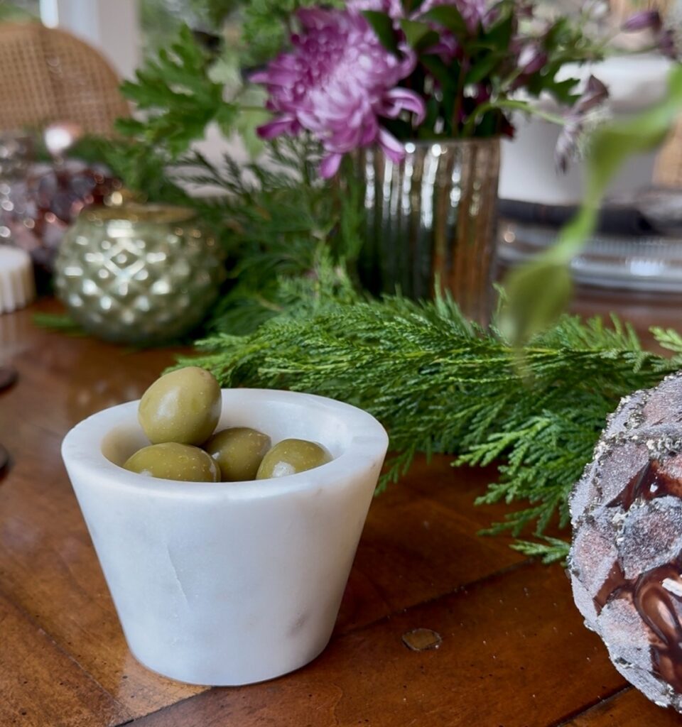 It may seem simple, but a small dish for salt, olives, or garnishes makes your tablescape feel intentional and complete. Incorporating small dishes helps break up the layout, adds dimension, and brings a thoughtful detail that guests always notice.