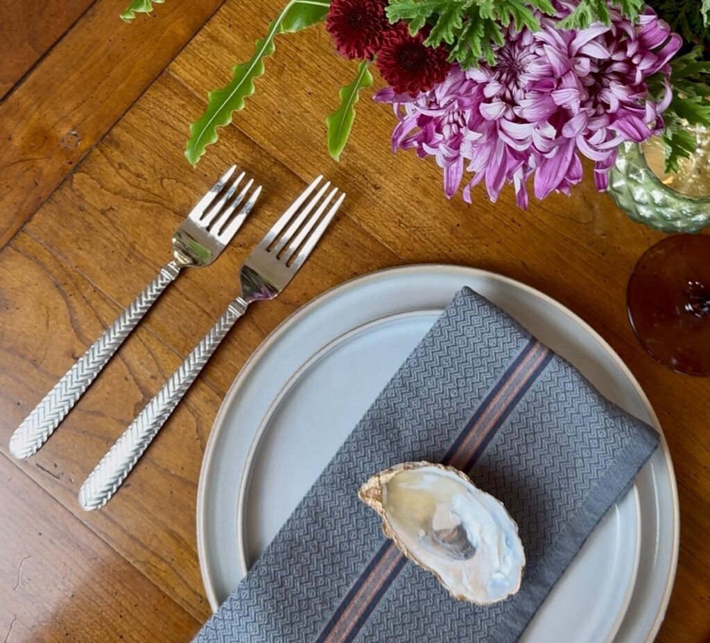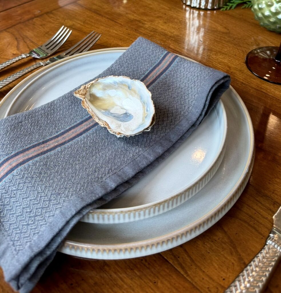Linen napkins instantly add texture, style, and sophistication to any tablescape. They’re an easy upgrade from paper napkins and create a soft, layered look that feels inviting and intentional. Top it with a decorative napkin accent such as an oyster shell, rosemary, or a personalized place card adds a curated touch to any tablescape.