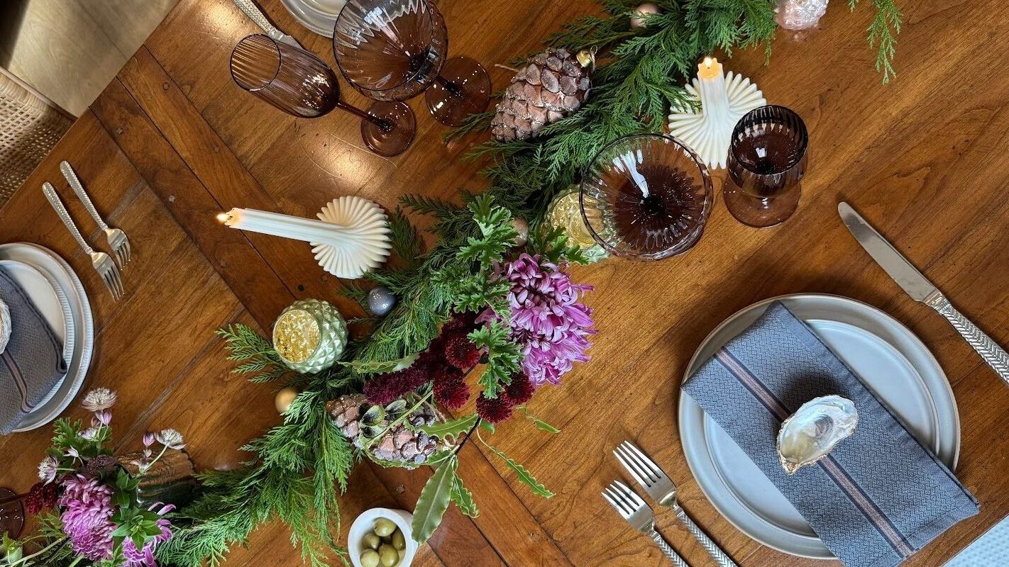 By using these five pieces; linen napkins, statement flatware, real florals or greenery, low sculptural candle holders, and a small dish for salt or olives you can create a tablescape that feels elevated and thoughtfully designed.